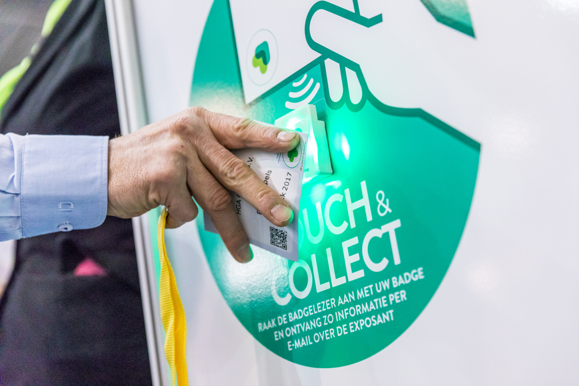 Raak de badgelezer van de exposant aan met jouw badge